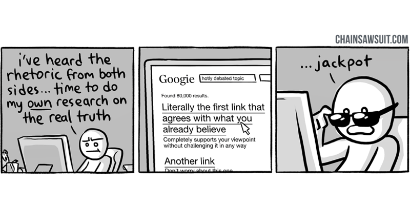 The Internet is filled with anti-vaxxers, World Trade Center truthers, Kennedy theorists, religious fanatics of all stripes, and people who think that Barack Obama is a foreign-born Muslim (he's not). Our beliefs aren't tied to facts. At least half of us are absolutely certain Heaven exists, ruled over by a personal God — not some vague force or universal spirit but "a guy". More than a third of us believe not only that global warming is no big deal but that it’s a hoax perpetrated by a conspiracy of scientists, government, and journalists. People are free to believe whatever they want to believe by embedding themselves in "echo chambers" that reinforce what they already believe and by discounting anything they happen to see that does not align with their beliefs.